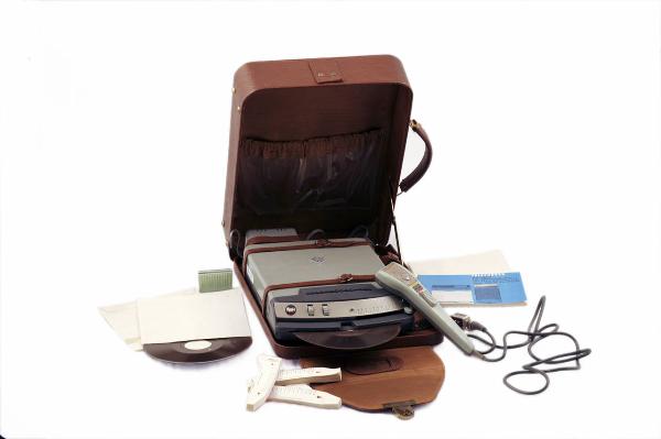Dittafono a dischi magnetici con uno chassis in metallo verniciato di grigio. La parte frontale presenta un inserto in plastica di colore grigio scuro, sul quale sono concentrati i comandi e consistono in un indicatore visivo dell'accensione dell'apparecchio, due rotelle per la selezione del livello di volume e del tono. Sempre sul lato anteriore si trovano la fessura per l'inserimento dei dischi magnetici e un contaminuti costituito da un indicatore scorrevole lungo una scala graduata da 0 a 10; ai lati della scala graduata si trovano due piccoli supporti per fissare i foglietti di carta per appuntare la durata della registrazione. Sul fianco destro si trovano il commutatore per la selezione del segnale di ingresso da microfono e accoppiatore telefonico ed i supporti per il collegamento del microfono, dei comandi a distanza e dell'accoppiatore telefonico. La boccola per la connessione del caricabatteria al cadmio si trova sul lato posteriore dell'apparecchio. Il dittafono è conservato all'interno di una valigetta in pelle marrone insieme al caricabatteria al cadmio, a due dischi magnetici, a quattro blocchetti di fogli di annotazioni e al microfono, provvisto di comandi di riavvolgimento, arresto, registrazione e riproduzione.