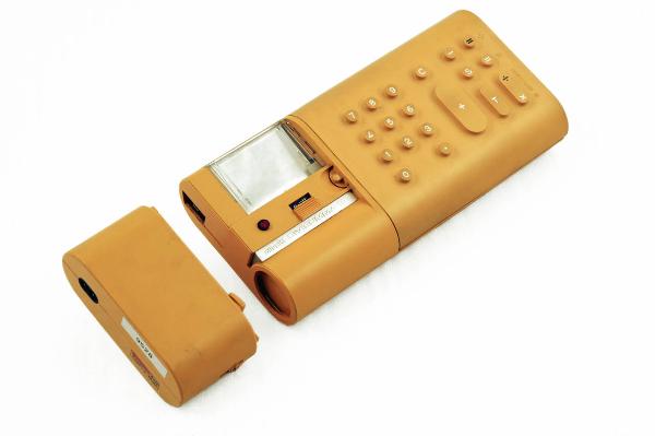 Calcolatrice elettronica con stampante, costituita da un corpo in plastica gialla dai lati anteriore e posteriore bombati. L'apparecchio presenta una tastiera ridotta ricoperta da una membrana di gomma; a destra della tastiera sono situati i pulsanti delle quattro operazioni aritmetiche, del totale e del totale parziale. A sinistra della tastiera si trova l'apparato di stampa delle operazioni svolte, funzionante con uno speciale rotolo di carta metallizzata. Al di sotto della stampante si trovano l'interruttore per l'accansione della calcolatrice, la rotella per la selezione del numero di cifre decimali da adoperare e una spia lumonosa per la segnalazione della disattivazione. Sul lato inferiore dell'apparecchio si trova lo sportello asportabile per l'inserimento del rotolo di carta metallizzata. La calcolatrice è dotata di un caricabatterie in plastica gialla della stessa forma da applicare sul fianco sinistro dell'apparecchio; sul fianco sinistro del caricabatterie si trova la presa bipolare per il collegamento del cavo di alimentazione. La calcolatrice è accessoriata con una batteria ricaricabile di riserva, il cavo per l'allacciamento alla rete elettrica, una confenzione di rotoli di carta metallizzata e una custodia in finta pelle per il trasporto.