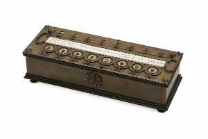 Macchina costituta da una corpo in metallo, al cui interno cela i meccanismi. Il fondo della macchina è in legno e poggia su quattro piedini anch'essi in legno; sul fondo si trova uno sportello apribile che permette la visione dei meccanismi. Sul lato superiore della scatola si trovano otto ruote, girevoli mediante uno stilo; la prima ruota a destra è divisa in dodici sezioni, la seconda in venti, le altre in dieci. Muovendo le ruote si imposta il valore della cifra da operare, visualizzabile nel totalizzatore nella parte superiore del piano, composto da due file di otto finestrelle corrispondenti alle otto ruote. Attraverso una linguetta mobile in metallo è possibile selezionare di volta in volta una delle due file del totalizzatore, coprendo l'altra.