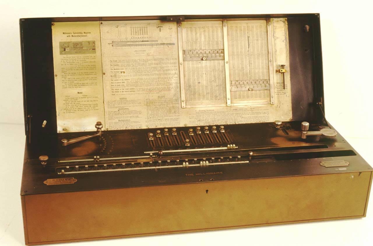 Calcolatrice meccanica costituita da una scatola in metallo, dotata di coperchio richiudibile e di impugnature laterali. Quando il coperchio è sollevato, la macchina presenta un piano su cui si concentrano i comandi operativi della calcolatrice. L'impostazione delle cifre avviene mediante dieci cursori correnti in altrettante feritorie longitudinali, poste nella parte centrale del piano; accanto ad ogni feritoia si trova una scala da 0 a 9. A sinistra dei cursori è collocata la leva per la selezione del moltiplicando e del divisore; a destra dei cursori invece sono situati il commutatore per la selezione del tipo di operazione da eseguire (addizione, moltiplicazione, divisione, sottrazione) e la manovella che comanda l'esecuzione dell'operazione. Nella parte anteriore del piano è collocato un carrello mobile, sul quale si trovano il totalizzatore a sedici spazi e l'indicatore di controllo a otto spazi; alla destra di ogni indicatore è posto una leva per l'azzeramento delle finestrelle. In corrispondenza di ogni finestrella del totalizzatore è posizionata una manopola per l'impostazione della cifra iniziale da operare. Nella parte interna del coperchio è applicato un foglio di carta riportante le istruzioni per l'utilizzo della macchina e una tabella per l'individuazione dei quozienti. La macchina è predisposta per un eventuale adattamento elettrico.