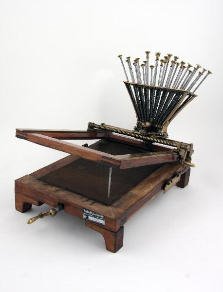 La macchina è costituita da un supporto di legno rettangolare, munito di telaio apribile sul lato minore atto a consentire inserimento del foglio di tipo A5; nella parte frontale presenta una manovella di ottone che consente lo slittamento del carrello dall'alto verso il basso mentre nella parte laterale destra è collocata un ulteriore manovella che permette lo scorrimento del carrello da destra verso sinistra. Il carrello è costituito da due barre cilindriche in ottone su cui è incastrato un cestello ad imbuto composto da 27 aste con punzoni di acciaio disposti su tre file recanti numeri, lettere e interruzioni. Alla base dell’imbuto è presente un’apertura in cui si inserisce l’inchiostro.
