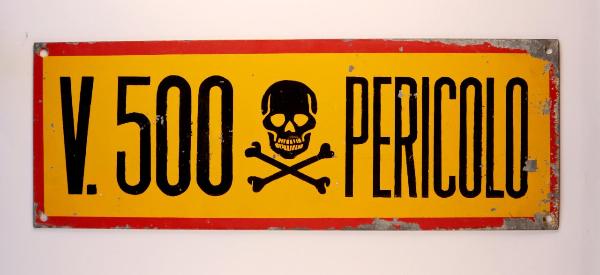 Cartello rettangolare riquadrato, con bordo in rosso e scritta e pittogramma in nero, ottenuti mediante l'utilizzo della verniciatura con mascherina, su fondo giallo. Presenta quattro fori agli angoli atti al fissaggio.\n