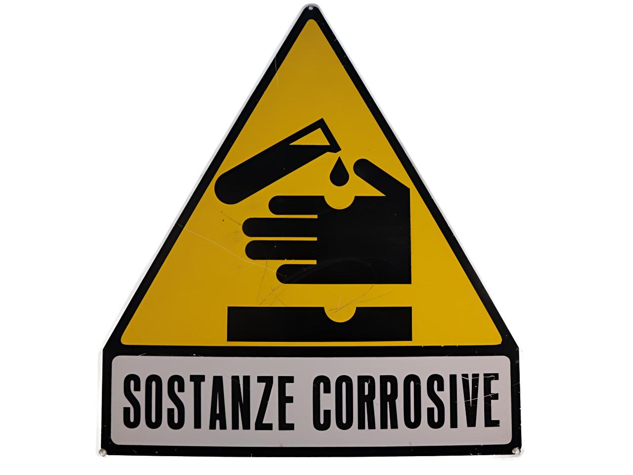 Cartello costituito da una parte triangolare, con pittogramma nero su fondo giallo, e una parte rettangolare recante scritta in nero su fondo bianco, ottenuti mediante l'utilizzo della serigrafia. Presenta tre fori agli angoli atti al fissaggio.\n\n
