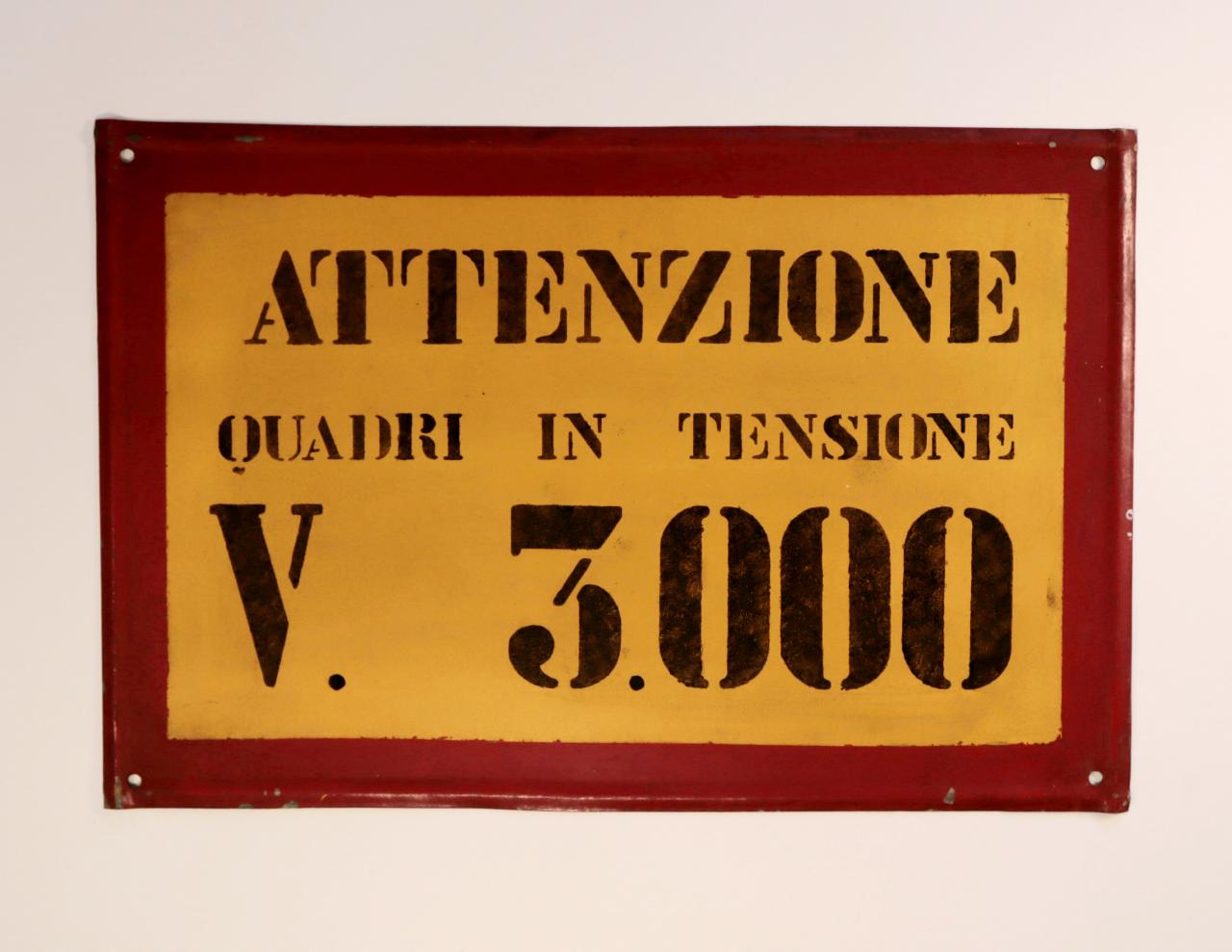 Cartello rettangolare riquadrato, con bordo in rosso e scritta in nero, ottenuta mediante l'utilizzo della verniciatura con mascherina, su fondo giallo. Presenta quattro fori agli angoli atti al fissaggio.