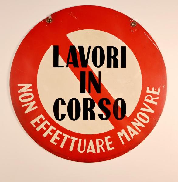 Cartello rotondo con bordo esterno in rosso recante una scritta in bianco, e scritta in nero su fondo bianco, nella parte interna, attraversata da una striscia rossa. La grafica è ottenuta mediante l'utilizzo della serigrafia. Presenta due fori nella parte superiore atti al fissaggio.\n\n