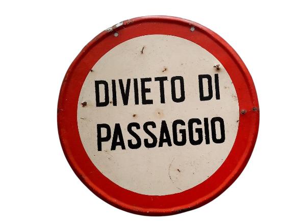 Cartello rotondo con bordo esterno in rosso, recante al centro scritta in nero su fondo bianco, ottenuta mediante l'utilizzo della verniciatura con mascherina. Presenta due fori nella parte superiore atti al fissaggio.\n\n\n