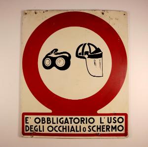 Cartello rettangolare recante, nella parte superiore, la riproduzione di un cartello rotondo con bordo esterno in rosso e al centro un pittogramma in nero su fondo bianco, e nella parte inferiore, un rettangolo riquadrato in rosso con scritta in nero su fondo bianco. La grafica è ottenuta mediante l'utilizzo della serigrafia. Presenta quattro fori agli angoli atti al fissaggio.\n\n