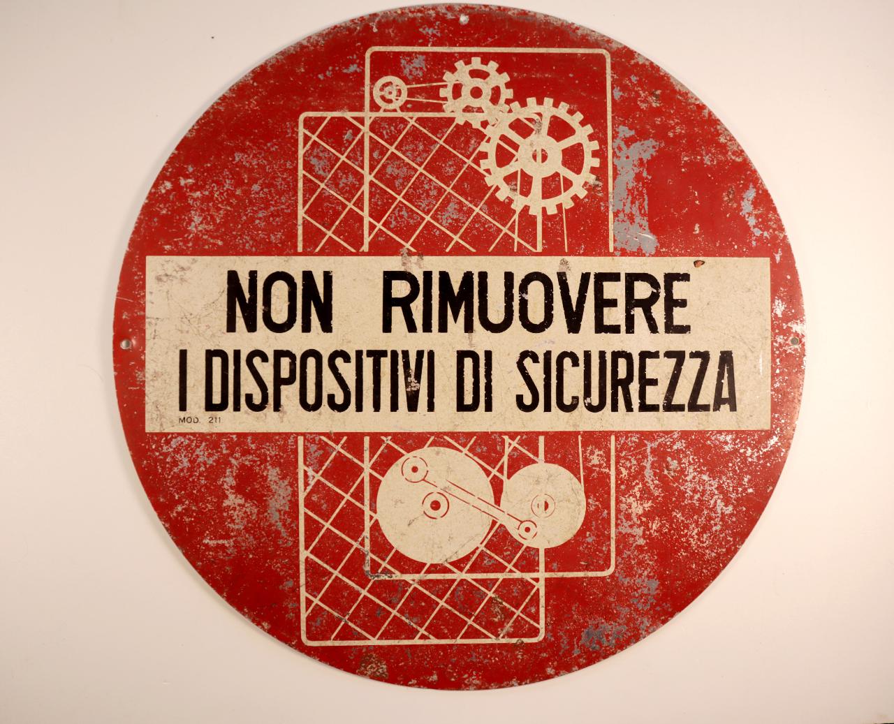 Cartello rotondo, recante pittogrammi bianchi su fondo rosso e scritta centrale, entro rettangolo, in nero su fondo bianco, ottenuti mediante l'utilizzo della serigrafia. Presenta tre fori lungo il bordo atti al fissaggio.\n\n\n