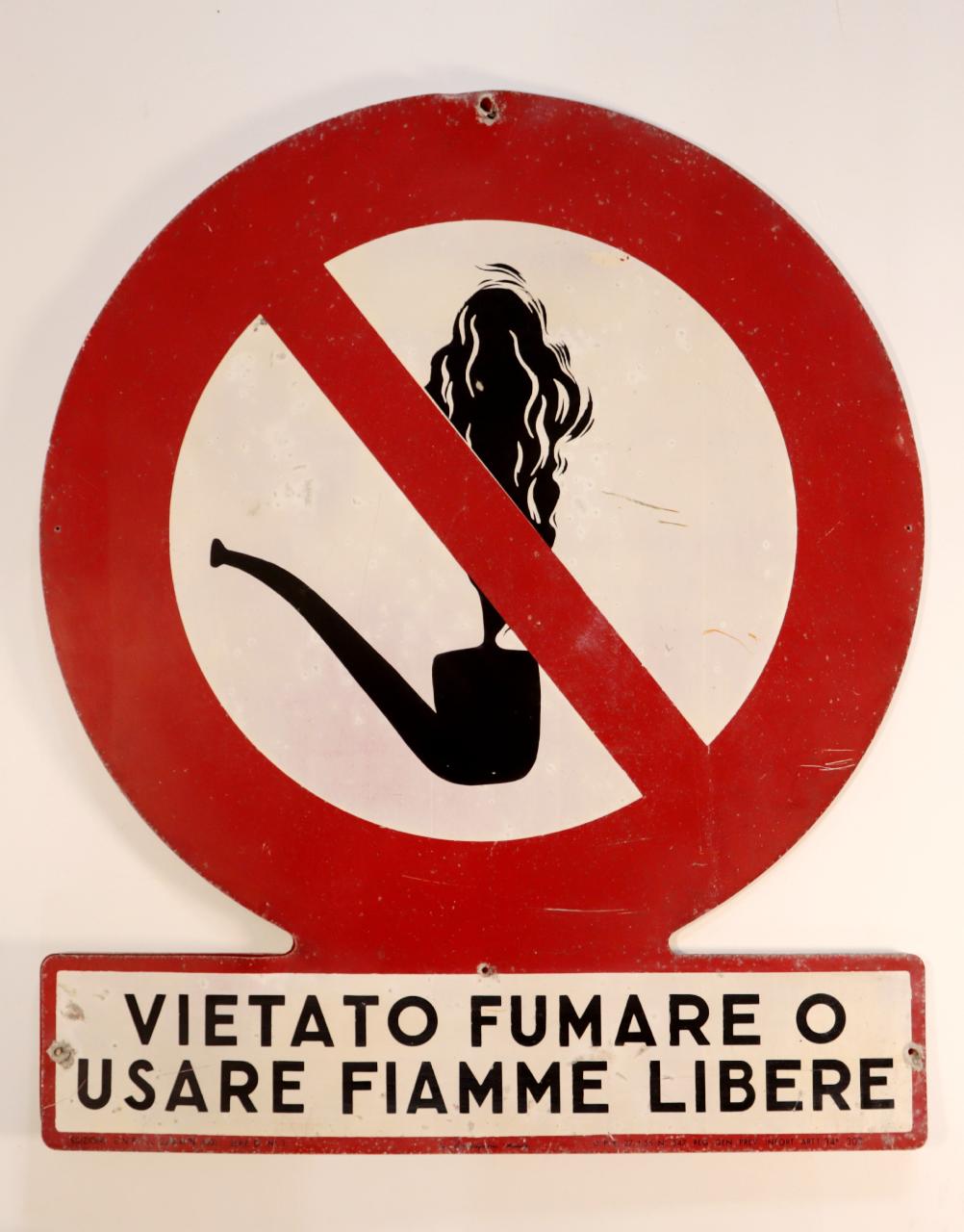 Cartello composto da una parte superiore rotonda con bordo esterno in rosso e al centro un pittogramma in nero su fondo bianco attraversato da una linea rossa, e nella parte inferiore, un rettangolo riquadrato in rosso con scritta in nero su fondo bianco. La grafica è ottenuta mediante l'utilizzo della serigrafia. Presenta tre fori lungo il bordo nella parte superiore e due fori ai lati del rettangolo atti al fissaggio.\n\n\n
