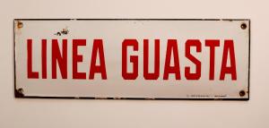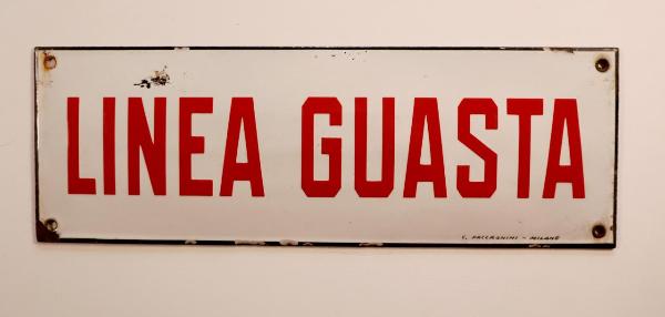 Placca rettangolare in metallo smaltato con scritta in rosso su fondo bianco, ottenuta mediante l'utilizzo della serigrafia. Presenta quattro fori agli angoli atti al fissaggio.