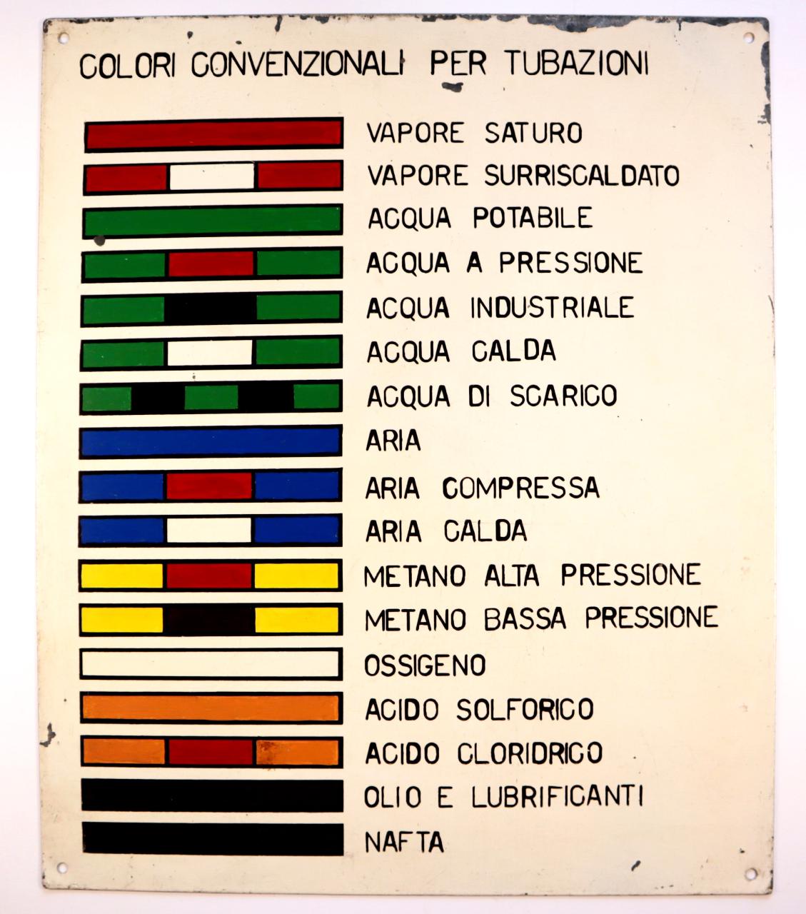 Cartello rettangolare con scritte in nero e pittogrammi a colori, ottenuti mediante l'utilizzo della verniciatura con mascherina, su fondo bianco. Presenta quattro fori agli angoli atti al fissaggio.