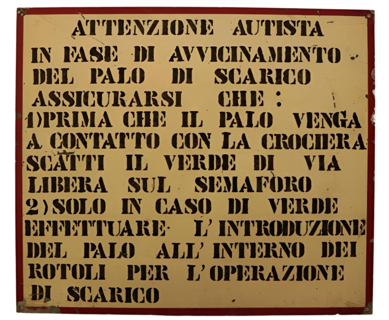 Cartello rettangolare riquadrato, con bordo in rosso e scritta in nero, ottenuti mediante l'utilizzo della verniciatura con mascherina, su fondo bianco. Presenta quattro fori agli angoli del rettangolo atti al fissaggio.\n\n
