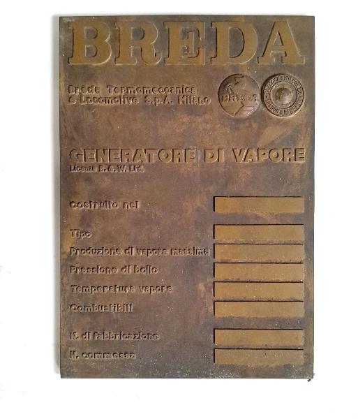 Lastra rettangolare in metallo fuso con scritte e due marchi rotondi in rilievo. Presenta due ganci nella parte superiore atti al fissaggio.\n\n\n