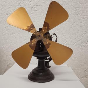 Apparecchio/agitatore d'aria elettrico composto da un piedistallo in ghisa sul quale è fissato il blocco motore. L'elica, a quattro pale, priva di protezione, è fissata direttamente al corpo retrostante.
