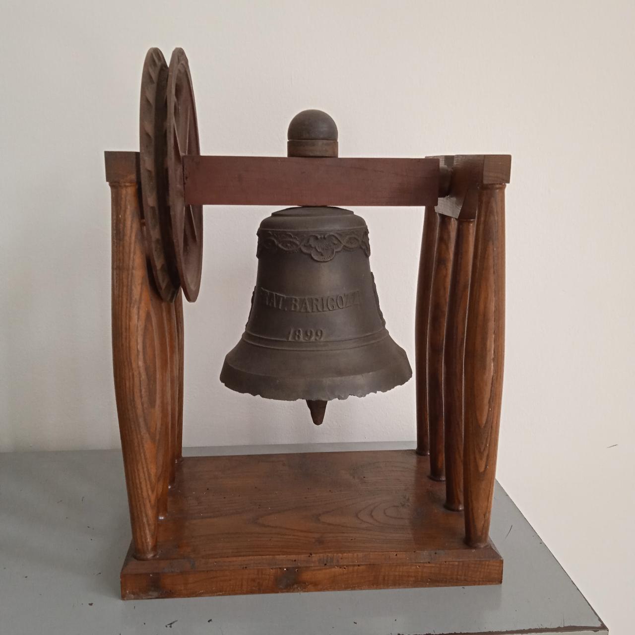 Campana in bronzo montata su supporto di legno, utilizzata soprattutto come marcatempo.