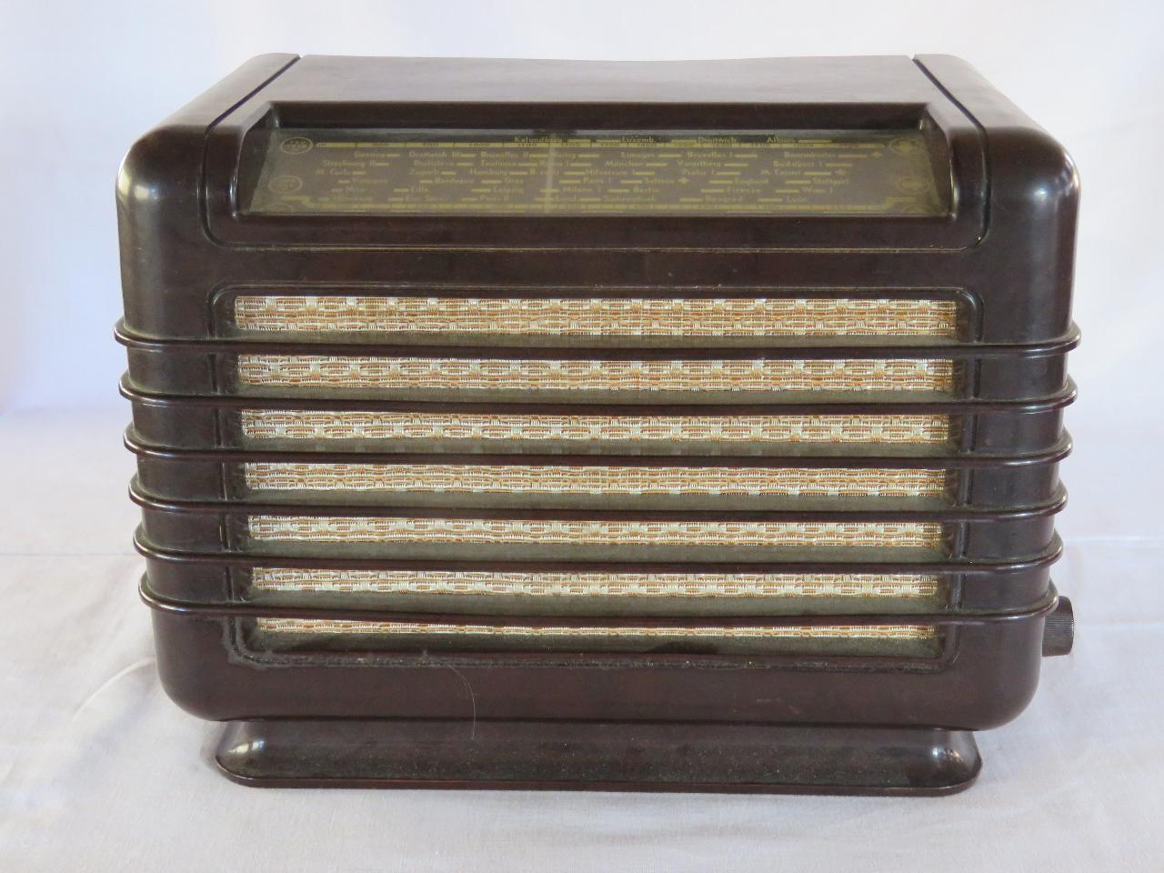 Apparecchio radio ad andamento orizzontale di dimensioni contenute e con mobile in bachelite. La parete frontale è quasi interamente occupata dall'altoparlante magnetodinamico coperto da un tessuto e una griglia in bachelite. Nella parte superiore, lungo lo spigolo e inclinata a 45° è inserita la scala parlante illuminata su cui sono indicate le lunghezze d'onda e le località. Sui lati sono disposte tre manopole (due a destra e una a sinistra) per accensione/spegnimento/regolazione del volume, sintonizzazione e selezione della gamma d'onda.\nSul retro, sotto ad una griglia protettiva, è visibile il circuito supereterodina ZF/IF 452KHz a 4 valvole con sei circuiti accordati in modulazione di ampiezza (AM) oltre all'altoparlante. Dal retro fuoriesce il cavo di collegamento all'alimentazione.
