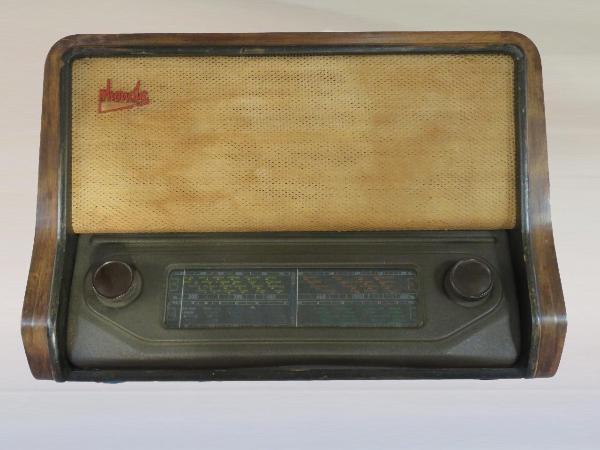 Apparecchio radio midget con mobile in legno di rovere lucidato con andamento orizzontale e forma trapezoidale.\nLa parte superiore della parete frontale è occupata dall'altoparlante elettrodinamico coperto da un tessuto, mentre quella inferiore è inclinata e coperta da una lastra in metallo verniciato nella quale sono inserite due scale parlanti separate e affiancate una per le due gamme d'onda media e una per le due di onde corte. Ogni scala riporta le lunghezze d'onda e le località. Alla sinistra delle scale è inserita una manopola perl'accensione/ spegnimento e regolazione del volume, alla destra una per la sintonizzazione. Sul lato destro è presente un selettore per la gamma d'onda.\nSul retro, sotto ad una griglia protettiva, è visibile il circuito supereterodina ZF/IF 470KHz a 5 valvole con sei circuiti accordati in modulazione di ampiezza (AM) oltre all'altoparlante con le sue bobine. Sul retro sono presenti le presa per antenna e terra, un'altra presa e il filo di collegamento all'alimentazione con il cambiatensione.
