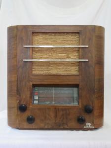 Apparecchio radio soprammobile ad andamento verticale con mobile in legno. La parte alta della parete frontale è occupata dall'altoparlante elettrodinamico circolare coperto da un tessuto e quella inferiore è occupata dalla scala parlante a indice scorrevole con indicazione delle località e delle lunghezze d'onda con diverse colorazioni a seconda della gamma d'onda, in francese. Sotto alla scala sono presenti quattro manopole per accensione/spegnimento e controllo volume, commutazione di gamma, sintonizzazione.\nSul retro è visibile il circuito supereterodina. Sul retro sono presenti alcune uscite non del tutto visibili e un cambiatensione.