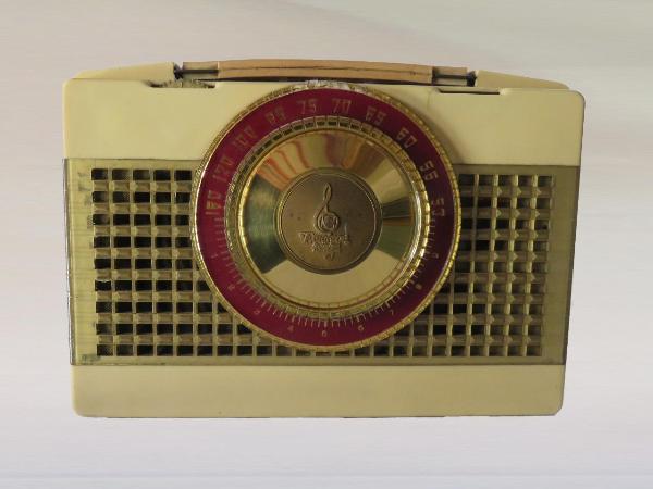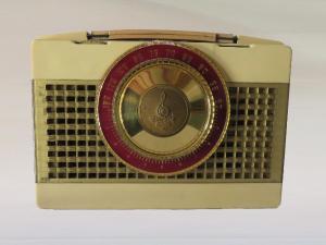 Apparecchio radio compatto portatile a forma di valigetta in materiale plastico color bianco avorio, con maniglia. La parete frontale presenta una griglia orizzontale in materiale plastico color oro con al centro la scala di sintonia su plastica oro e rossa ad indice ruotante con indicazione delle frequenze. Dietro alla griglia è presente l'altoparlante magnetodinamico circolare. Superiormente, a sinistra è presenta una manopola parzialmente sporgente dal profilo dell'apparecchio per accensione/spegnimento regolazione volume, a destra una spia di accensione. La sintonizzazione avviene agendo direttamente sul disco della scala di sintonia.\nAprendo l'apparecchio è visibile il circuito supereterodina a 4 valvole con circuiti in modulazione di ampiezza (AM).