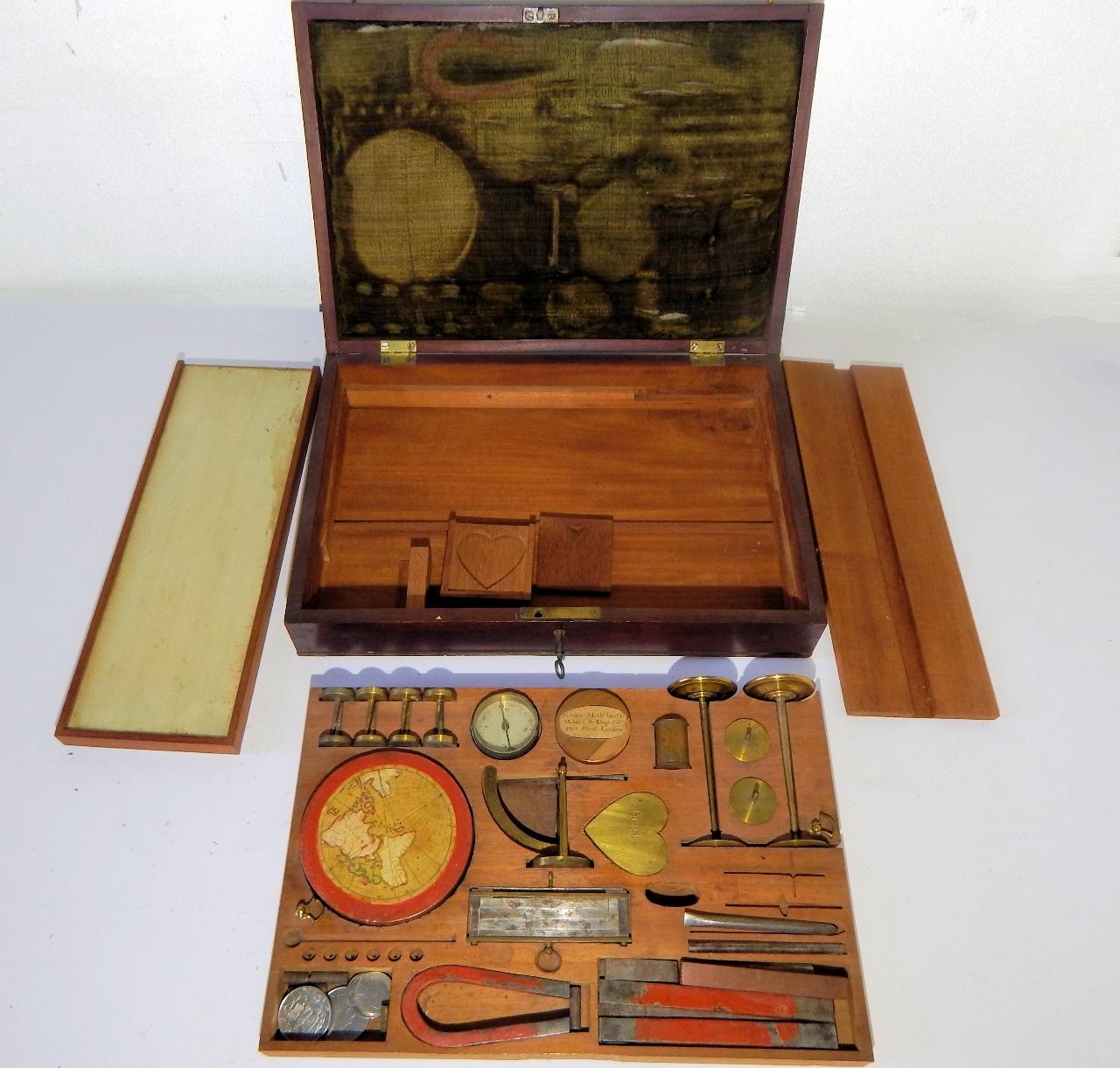 Si tratta di una cassetta per numerose esperienze sul magnetismo, in mogano con interni in velluto con doppio fondo e firmata. Possiamo notare un cuore su cui è scritto Brafs che è un vecchio termine inglese per indicare l’ottone (oggi si dice brass) che è caduto in disuso agli inizi dell’800; un modellino per evidenziare il campo magnetico terrestre che riporta in stampa un piccolo planisfero in cui si nota l’assenza nell’emisfero australe del polo sud.