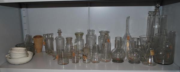 Complesso di strumenti da laboratorio in vetro, porcellana e materiale refrattario.