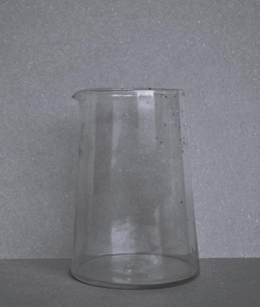 Contenitore in vetro trasparente di forma troncoconica con beccuccio, non graduato.