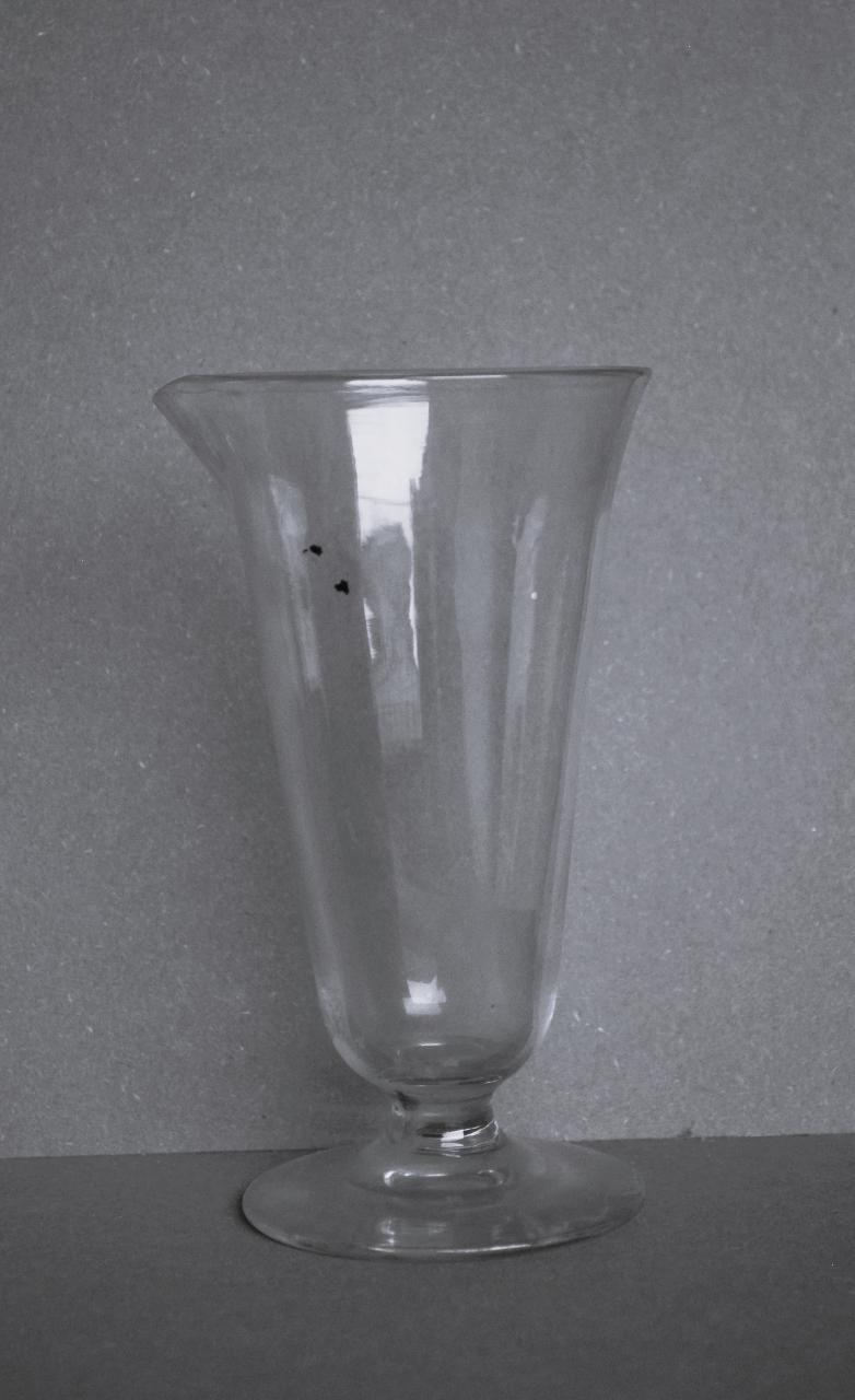 Contenitore in vetro trasparente, a calice, su corto stelo e base piatta; presenta un beccuccio sul labbro.\n