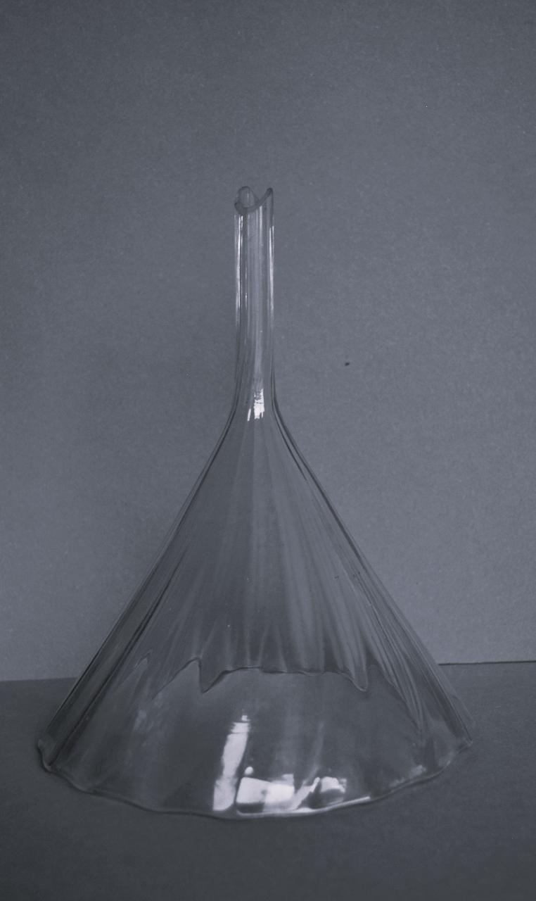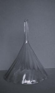 Imbuto in vetro trasparente di forma conica, con superficie ondulata e stelo corto; quest'ultimo si conclude con un taglio diagonale, ma un lato della terminazione è spezzato.
