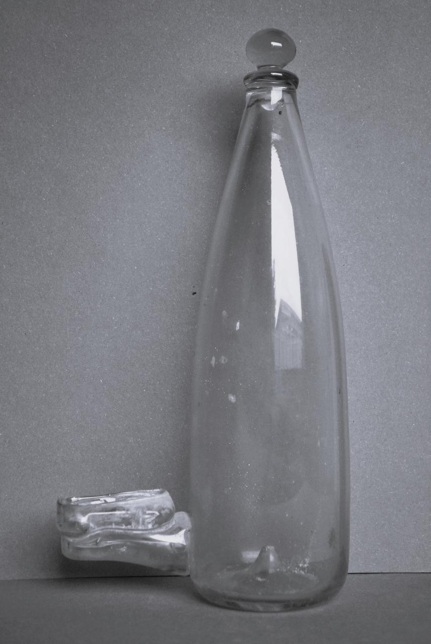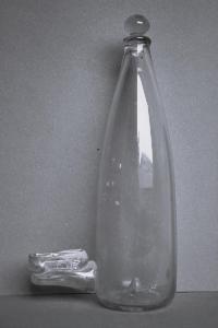 Bottiglia in vetro trasparente di forma conica chiusa con un tappo sferico, anch'esso in vetro; alla base è applicato un beccuccio di forma parallelepipeda.