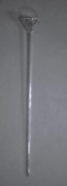 Strumento a imbuto di forma conica, in vetro incolore, con gambo lungo e sottile, diametro costante.