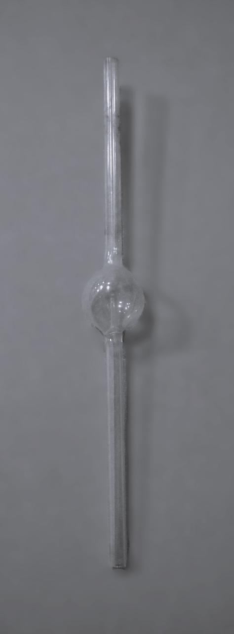 Tubo cilindrico, in vetro incolore, aperto ad entrambe le estremità; le terminazioni sono parzialmente fratturate. Presenta un'espansione sferica al centro, in cui confluisce un tubicino che attraversa internamente una delle due metà del cannello.\n