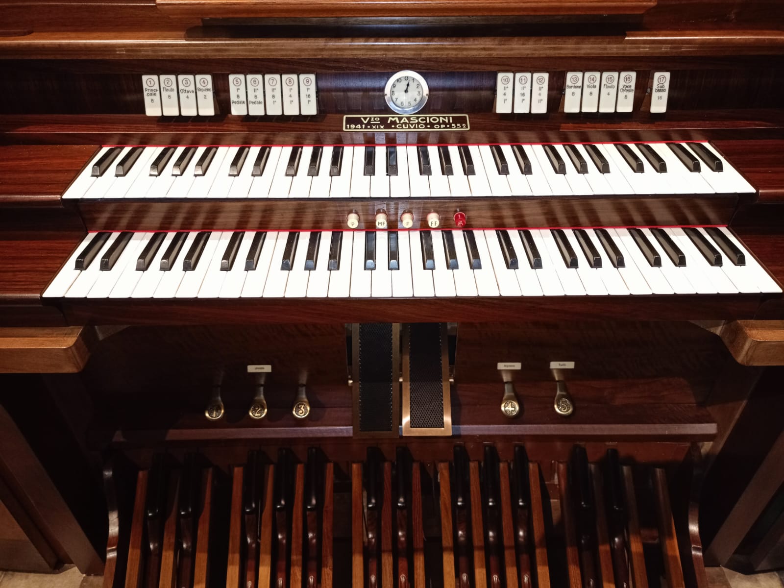 - NOTIZIE STORICO CRITICHE Lo strumento è stato costruito da Vincenzo Mascioni nel 1940-1941 quale opera n. 552. In occasione del sopralluogo effettuato dalla Famiglia organaria Mascioni nel gennaio 2024, si era constatato che, a più di ottant’anni dalla costruzione, lo strumento non era mai stato sottoposto ad alcun importante lavoro di restauro, e ciò veniva confermato dall’originalità di ogni componente. Malgrado la bontà costruttiva e la migliore scelta delle materie prime impiegate, l’usura del tempo aveva reso indispensabile una revisione generale. La Famiglia organaria Vincenzo Mascioni ha effettuato quindi un restauro conservativo con il quale si è riportato lo strumento al completo funzionamento, ripristinando tutte le sue funzioni. Le operazioni di restauro e ripristino funzionale si sono concluse il 4 aprile 2025