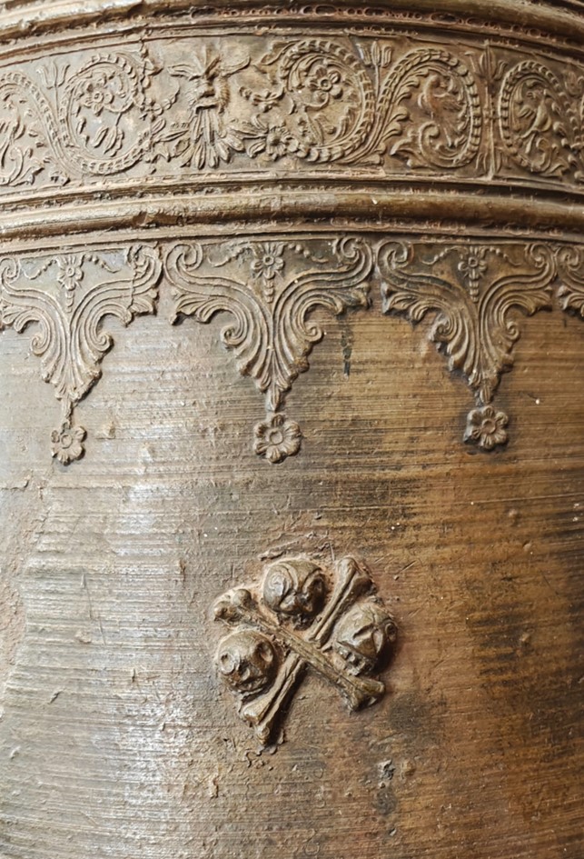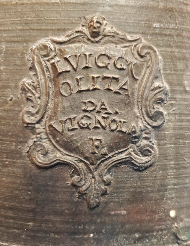 Campana dalla testa a ventaglio firmata dalla nota Fonderia Olita di Vignola (PZ). È un pregevole esempio di fusione in bronzo dell’ultimo quarto del ‘700 che presenta i caratteri stilistici delle arti applicate del tardo rococò. Dalla corona, fino alla parte mediana, è circondata da fasce ornamentali definite da linee parallele. Al centro compare la dedica a san Michele. Sono sottili rilievi a motivi classici, con serti vegetali naturalistici e stilizzati, intramezzati nella parte alta da testine d’angelo. Poi ancora stelline, piccole margherite: sono tutti elementi che caratterizzano fortemente l’abbondante produzione degli Olita e che, per analogia, firmano altre campane prive di marchio di fabbrica esposte nel Museo Marinelli