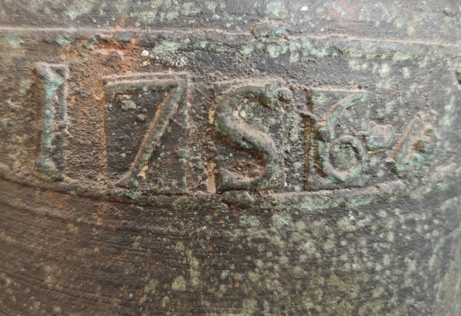 Campana con corona a ventaglio con tre fori di aggancio al ceppo: quello superiore di sagoma quadrilatera, i due più in basso di forma a goccia. La campana è percorsa da sottili linee parallele nelle parti inferiore e superiore del corpo. Non sono presenti altri fregi od iscrizioni tranne la data posta in una fascia determinata da 2 linee, poco sotto la calotta. Essa è scritta a numeri arabi (gli ultimi 2 di stile floreale) tratti da matrici di legno di 4,2 cm di altezza e varianti tra 1,4 e 2,8 cm di larghezza. È notevole e interessante l’ingabbiatura che ne racchiude i 2/3 inferiori. Essa mostra il vano tentativo di mettere la campana in sicurezza, preservandola da ulteriori rotture e procrastinandone l’uso. Sono stretti sulla base, e a 26 cm da essa, 2 anelli costrittori creati con fascette di ferro dell’altezza di 2cm. Tre analoghe fascette li uniscono tra loro tramite punti di saldatura e tre bloccaggi ad “u” li assicurano alla base. La campana presenta non influenti abrasioni sulla calotta. Il perimetro di base è scheggiato in alcuni punti. Sul retro della campana, corrispondentemente al taglio della corona, partendo dalla base si apre un profondo taglio verticale che la taglia fino all’altezza dell’anello superiore. Da qui si diramano, verso l’alto, due lesioni simmetriche che circondano per 2/3 il dorso della campana. Dove i tagli si biforcano la campana presenta un grande foro di forma irregolare (circa 6,4x 4,4cm)