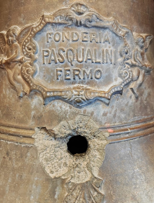- NOTIZIE STORICO CRITICHE La rovinatissima campana è opera della fonderia Pasqualini che opera a Fermo dal 1912 ma precedentemente aveva officina a Montedinove (vedi campana n.320- 1908- MUSEO MARINELLI) . La campana 159, proveniente dalla stessa fonderia e datata 1927, mostra lo Stemma Pontificio concesso probabilmente da papa Pio XI negli anni immediatamente precedenti. Tra queste due date si colloca quindi la fusione di questa campana realizzata quando i Pasqualini lavoravano già a Fermo ma non avevano ancora ricevuto il Titolo Pontificio. Questa fonderia fu un’eccellenza isolata dell’arte fusoria marchigiana. Collocò campane dal Veneto alla Sicilia fino a chiudere i battenti negli anni ‘70 del ‘900. La bottega fu fondata dal sacerdote Francesco Pasqualini (1734-1803) che fu allievo di un eccelso maestro, il fonditore Giovan Battista Donati. Non abbiamo notizie riguardanti la collocazione della campana. Probabilmente sarà stata concessa alla Fonderia Marinelli come scarto metallico come risarcimento di guerra nel periodo tra il1945 ed il 1948. Il numero 30 inciso (erroneamente) 2 volte sulla calotta è un riferimento che lo confermerebbe. La campana non venne rifusa ma conservata con rispetto a testimonianza degli atti ripugnanti commessi dai nemici a dileggio delle comunità dei fedeli
