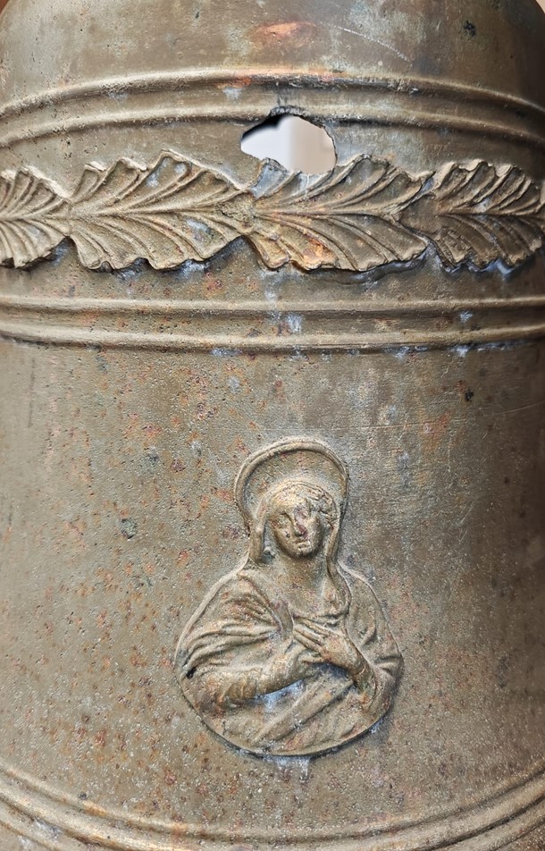 La campana appare drammaticamente rovinata in più punti: è completamente priva della corona e presenta fori di arma da fuoco di grosso calibro. I proiettili hanno puntato alla faccia anteriore della campana, quella esposta dal basso, colpendola a 14 cm dalla base e sulla calotta. Sono evidenti i fori di uscita che hanno causato rispettivamente un foro e un’escoriazione in basso dove, in sezione, il bronzo è più spesso, l’esplosione di un grosso pezzo lì dove è più sottile. Centralmente, sulla faccia anteriore della campana, compare un piccolo bassorilievo di Madonna a mezzobusto (6,5x 9cm) di buona fattura. Non compaiono altre dediche oltre al marchio di fabbrica contenuto in una vistosa cornice vagamente quadrilatera, centrale al corpo della campana e sostenuta lateralmente da due angioletti. Sulla calotta è inciso 2 volte il numero 30, riferibile probabilmente al computo del materiale metallico restituito alla fonderia Marinelli come risarcimento di guerra dopo il secondo conflitto mondiale