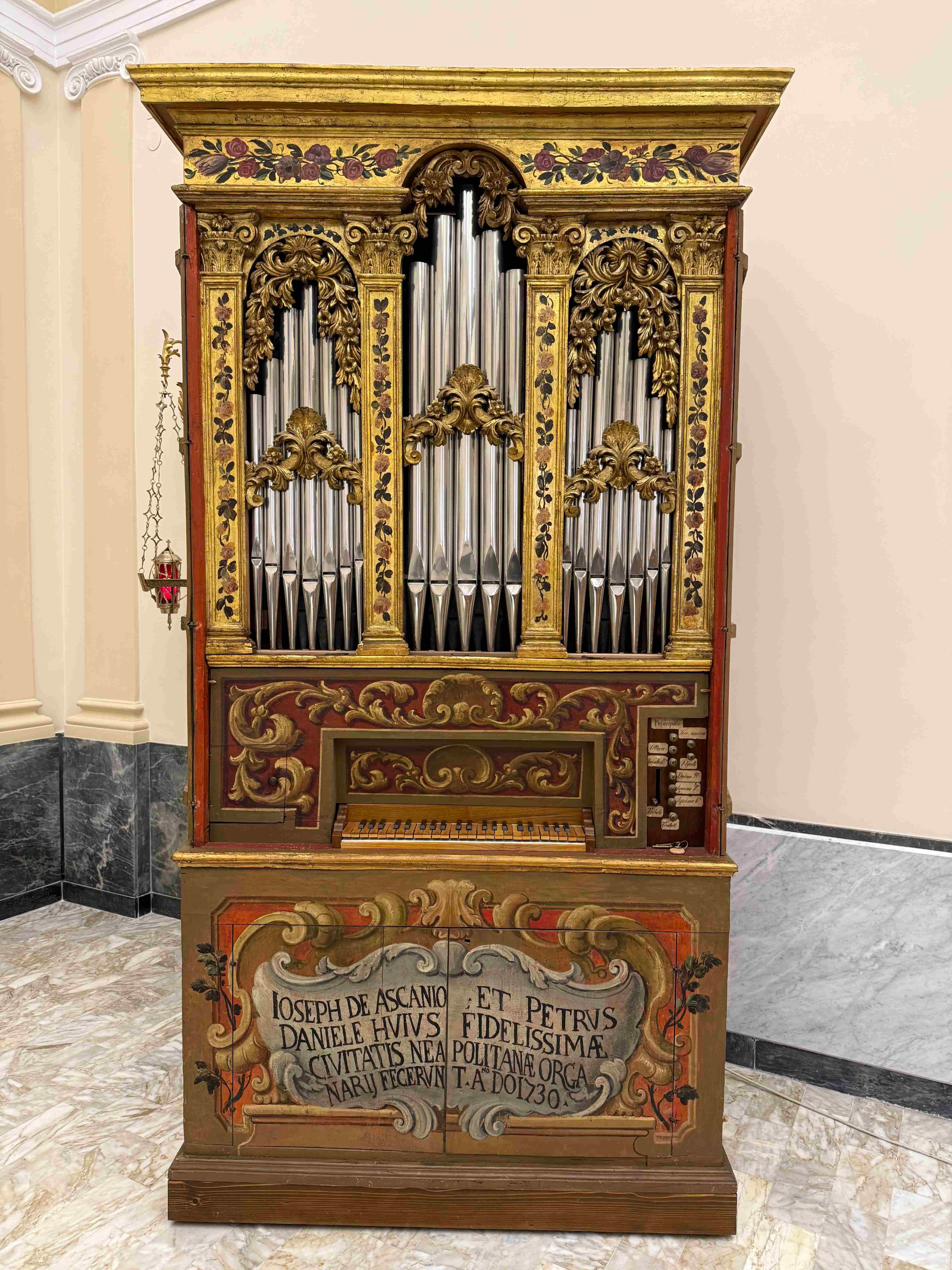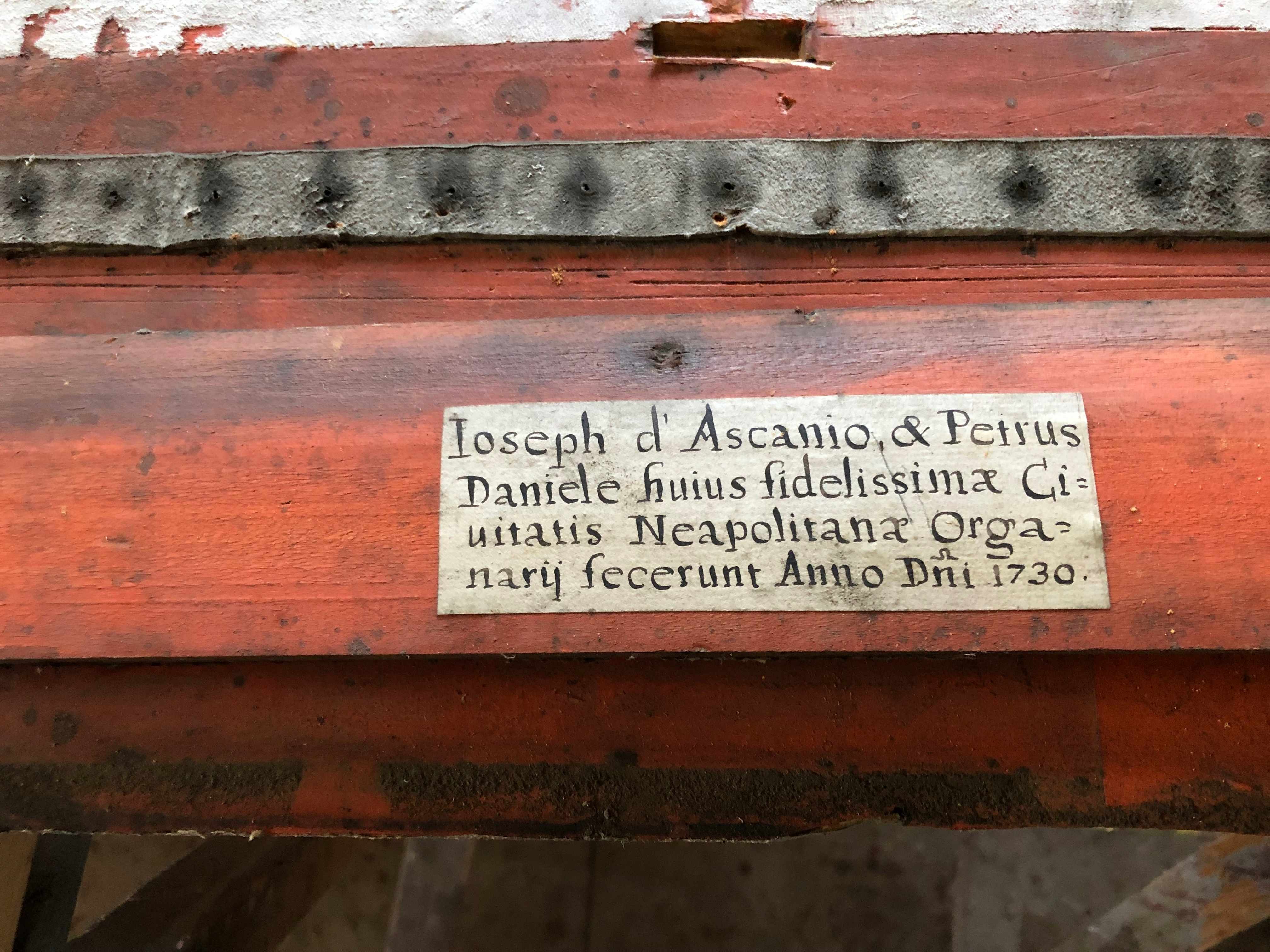 - ISCRIZIONE IOSEPH DE ASCANIO ET PETRVS DANIELE HVIVS FIDELISSIMAE CIVITATIS NEAPOLITANAE ORGANARIJ FECERVNT. A DO 1730
