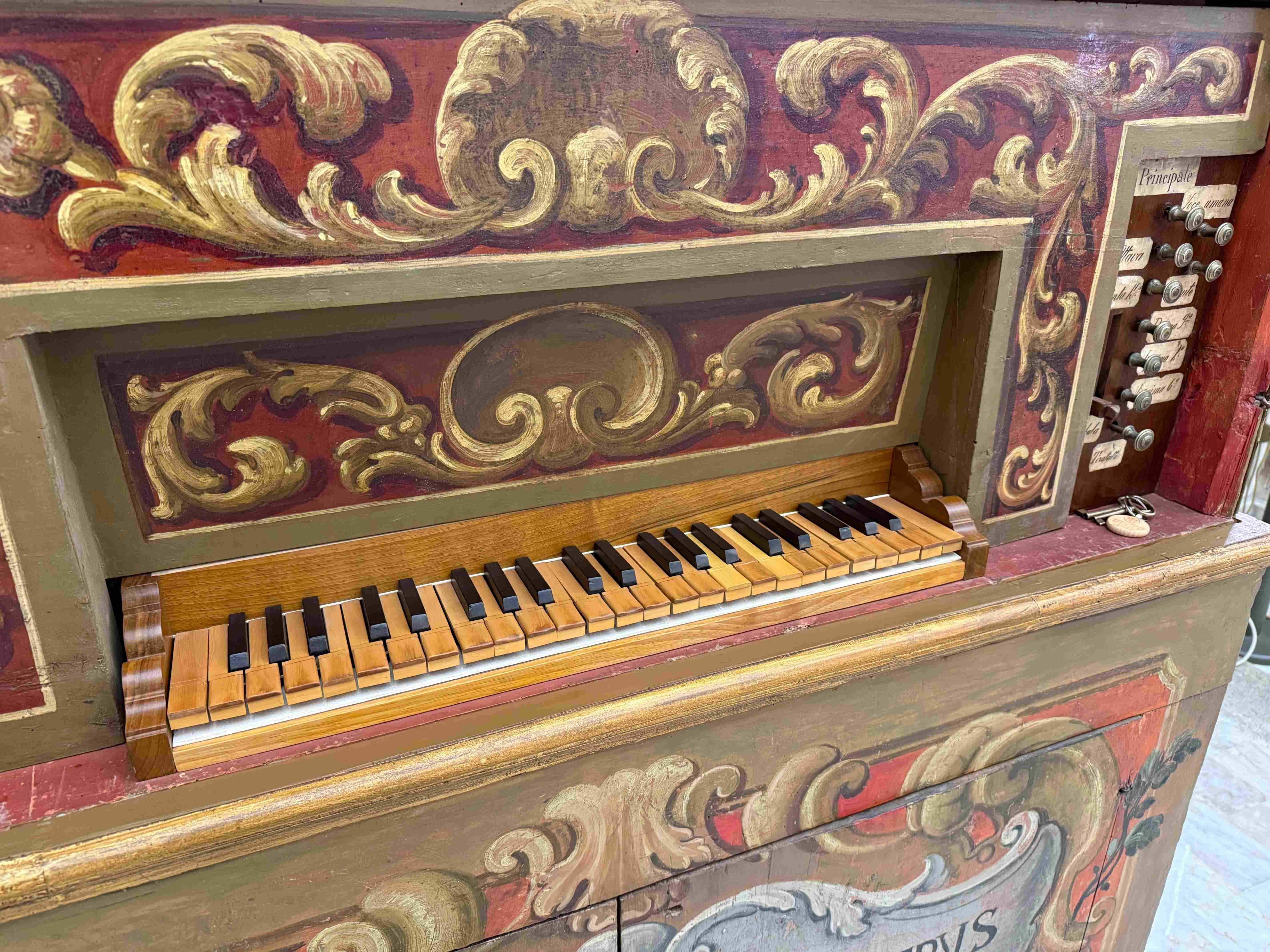 organo positivo racchiuso in cassa lignea finemente decorata, completa di cornicione, cornici, colonne, capitelli, fregi e festoni decorativi per le tre campate. Il basamento presenta due portine apribili decorate a mo' di cartiglio con iscrizione documentaria relativa ai costruttori
