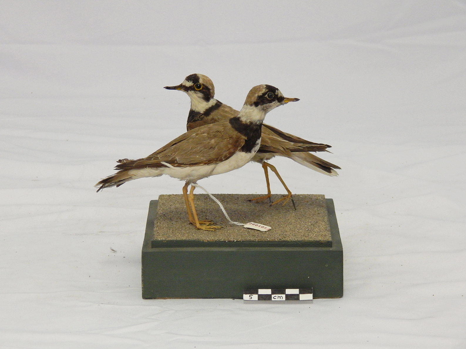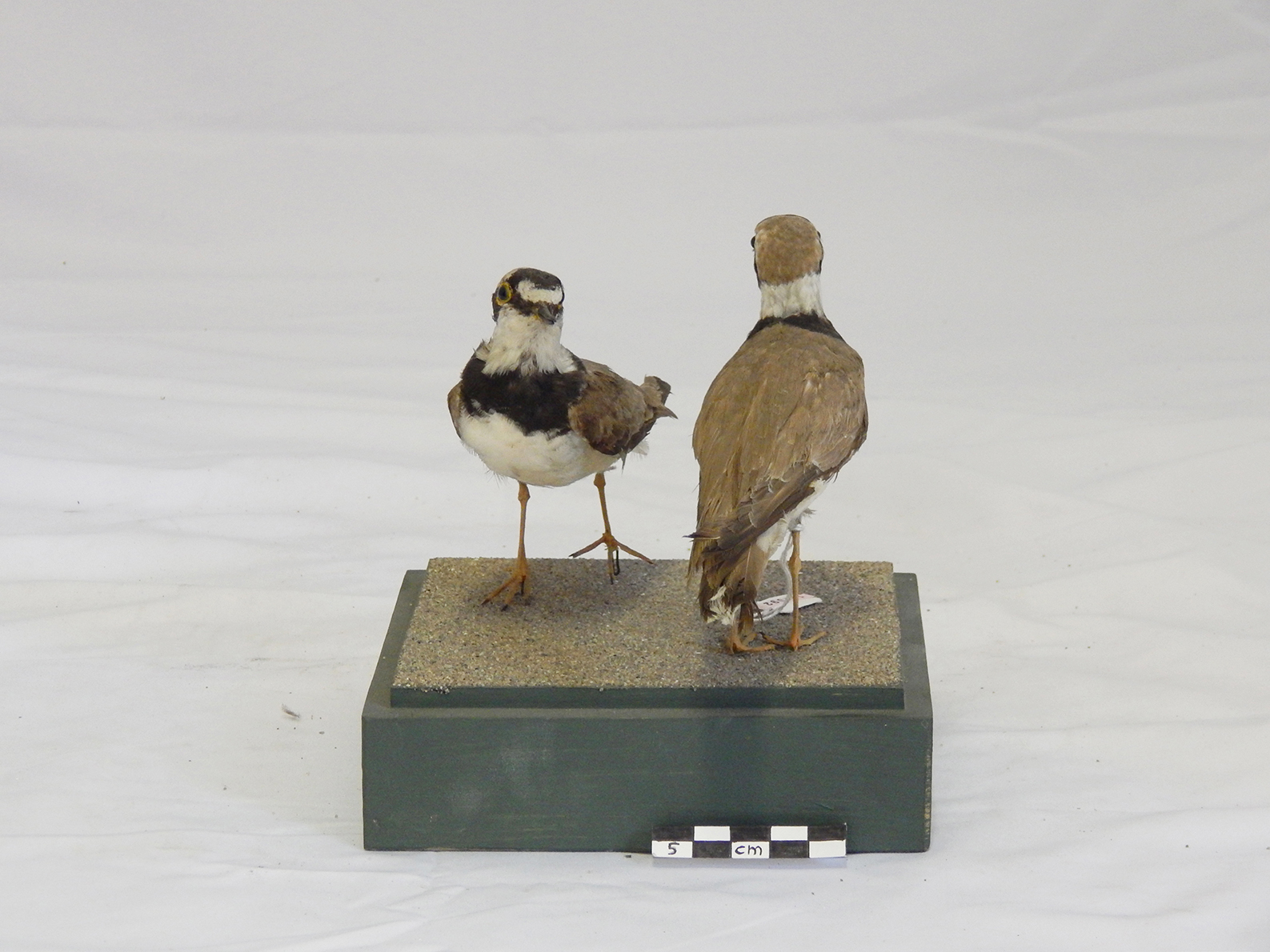 Coppia di esemplari di corriere piccolo tassidermizzati, montati su base