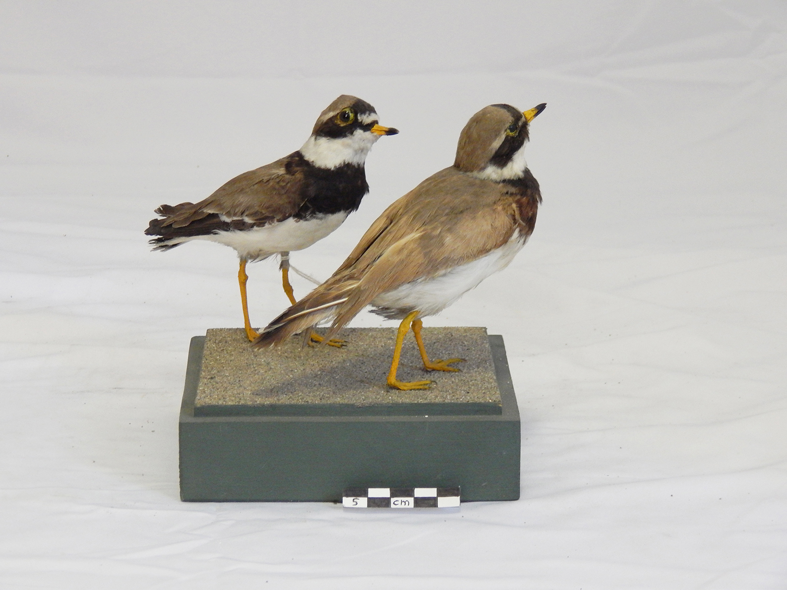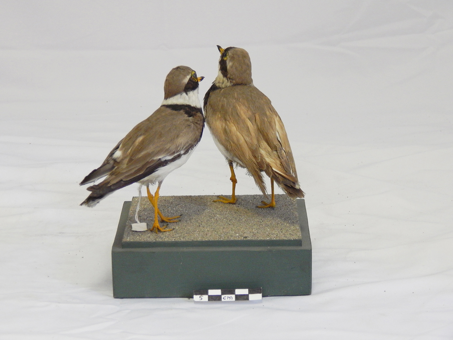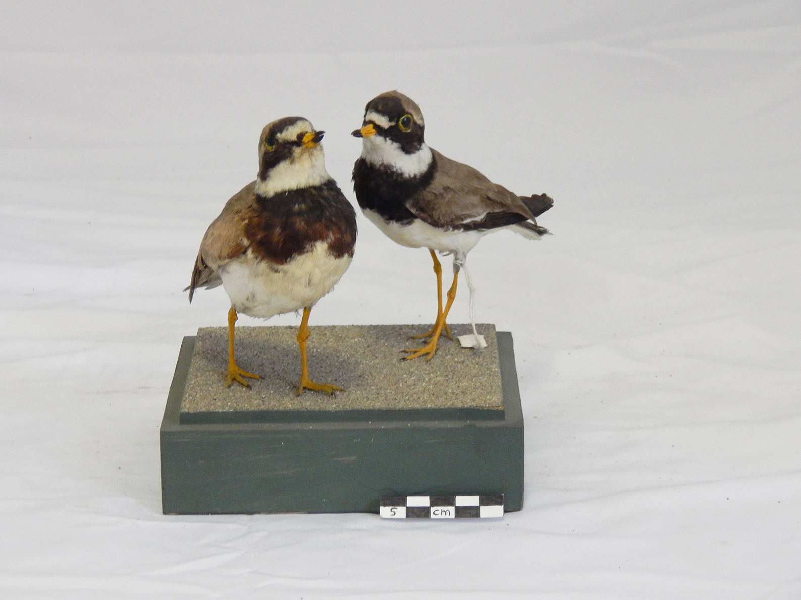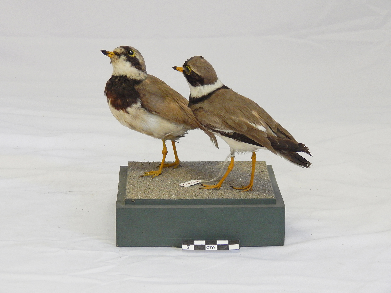 Coppia di esemplari di corriere grosso tassidermizzati, montati su base