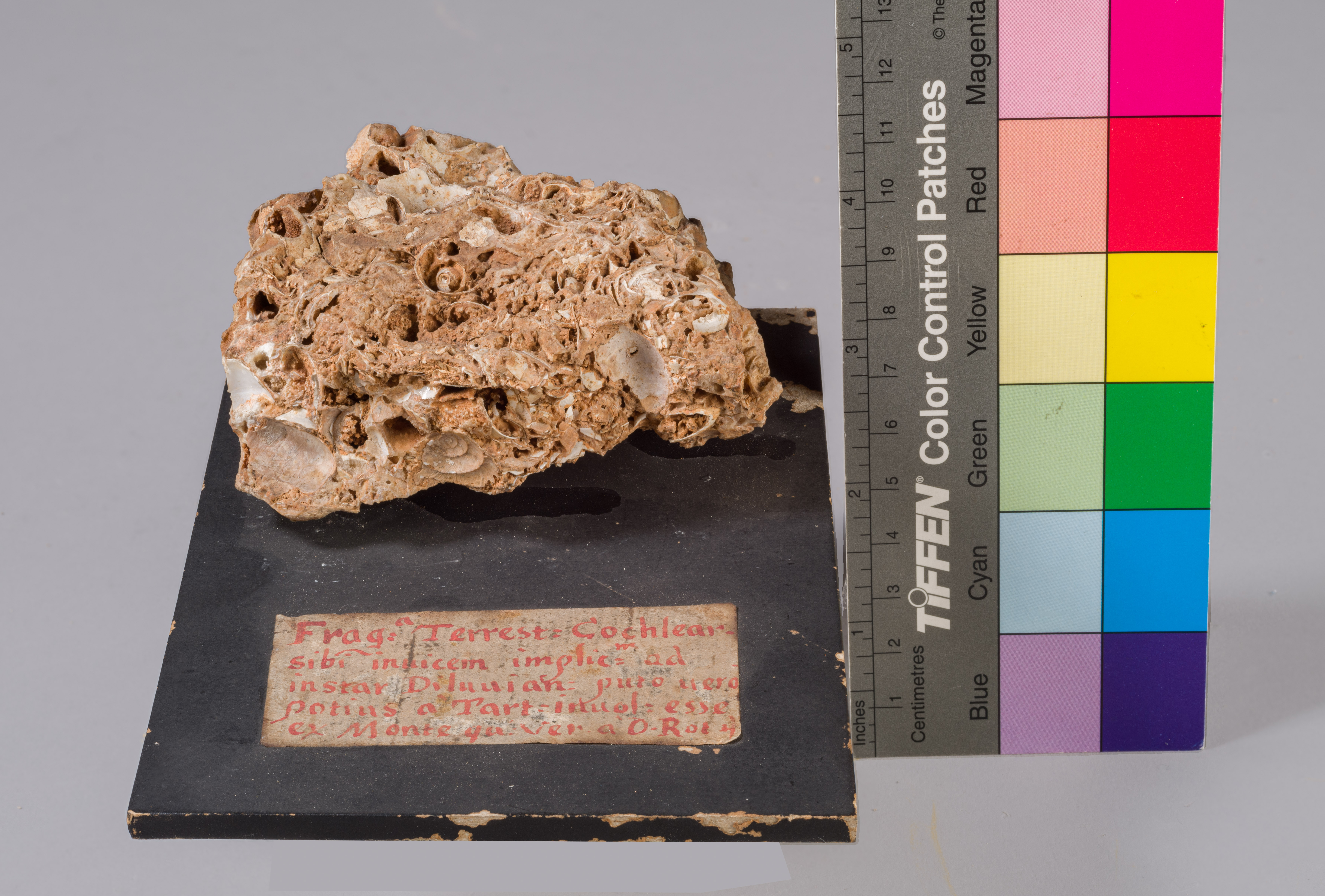 - NOTIZIE STORICO CRITICHE Pezzo del settecentesco Museo Diluviano dell’Istituto delle scienze di Bologna, ma di probabile derivazione aldrovandiana. La didascalia del cartellino, probabilmente cinquecentesca, recita: “Frammenti di Cochlee terrestri dal segno sibillino implicato, simile alle diluviane ma in realtà piuttosto un involucro tartareo, dal Monte detto Primavera”