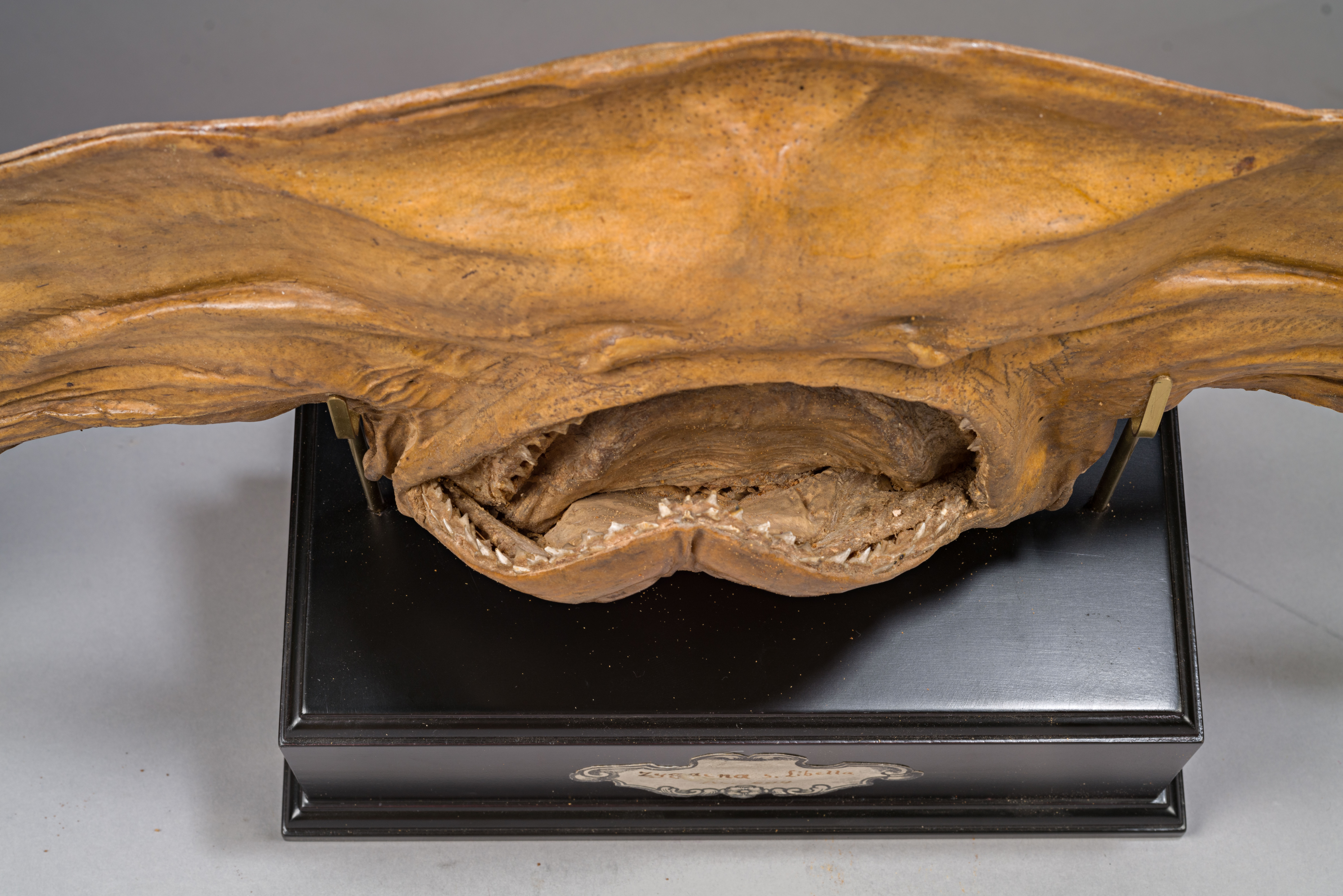 Capo e rostro di pesce martello, su base di legno verniciato di nero e sostegno di ottone
