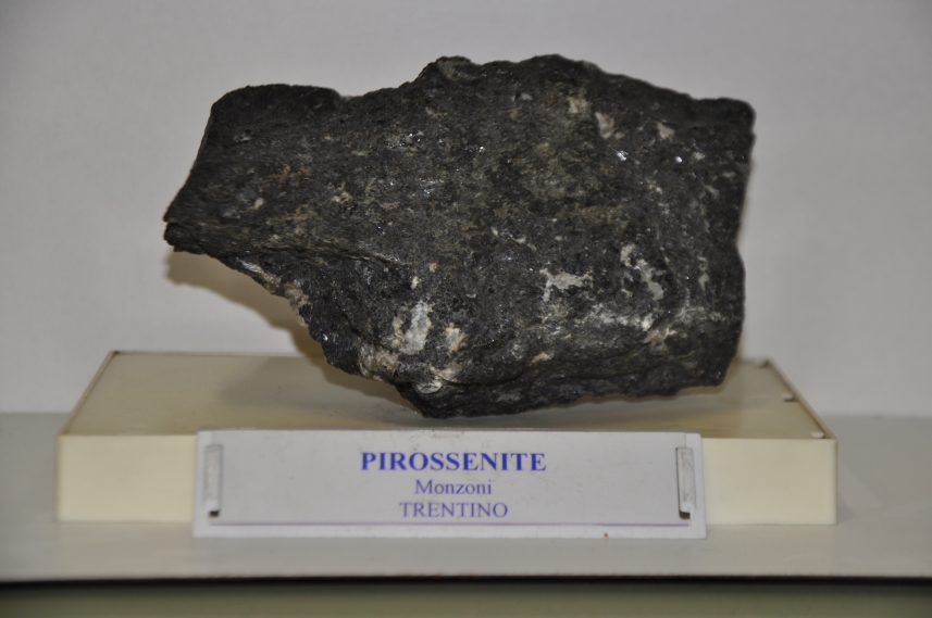 La roccia è olocristallina ed ha un discreto peso specifico. Il colore di fondo è molto scuro ed è dovuto soprattutto ai pirosseni, alla biotite e alla presenza non trascurabile dei minerali metallici. Pirosseni e biotite sono distinguibili per il diverso abito cristallino: lamellare e prismatico. Ben riconoscibili anche perché chiari su fondo scuro, sono plagioclasi e k-feldspati di discrete dimensioni e di cui peraltro non si riesce ad identificare l'abito cristallino. I minerali principali he costituiscono la roccia sono: Pirosseni , K-feldspato, Plagioclasi, Biotite, scarsa olivina e pochi cristalli di minerali metallici. Le dimensioni dei cristalli di pirosseno sono notevoli per alcuni individui (6 mm circa),mentre per altri variano tra 1,5 e 2,5 mm. Il Feldspato alcalino è presente con cristalli che arrivano anche a 1,3 cm mentre, dimensioni inferiori presentano i plagioclasi tra i quali gli individui più grossi misurano 4 mm, quelli più piccoli, in genere, 1,5mm. La biotite mostra cristalli di dimensioni discrete (3 mm circa), altri invece che non raggiungono un mm. Nella sezione sono presenti solo tre cristalli di olivina che hanno più o meno dimensioni intorno ai 2mm. I minerali metallici partendo da 0,5 mm possono arrivare ad 1 mm. I pirosseni difficilmente hanno bell'abito cristallino. A N// , i cristalli sono praticamente incolore oppure di un verde sbiadito con debole pleocroismo. Si notano geminati di due o più individui. L'alterazione, che ha generato prodotti serpentinici ha colpito gran parte dei cristalli e sembra procedere lungo superfici di frattura che, intrecciandosi, formano una struttura a maglie. Includono minerali metallici e biotite. La determinazione del C γ ha dato un angolo di 38° circa, per cui potremmo essere in presenza di pirosseni monoclini tipo diopside o augite. Tra i plagioclasi troviamo individui a grana maggiore con un discreto abito cristallino, quelli a grana piccola che sembrano xenomorfi. Alcuni cristalli hanno subito un processo di catalogazione che sembra procedere dal centro alla periferia dando origine a prodotti di natura argilloso-sericitica. Sono presenti sistemi geminati composti da cristalli la cui superficie di contatto sono ortogonali a quelli di un altro sistema geminato . Calcolo della composizione ha evidenziato termini Andesinici con % An intorno al 45/50 %. Il K-feldspato presenta tipicamente individui xenomorfi che risentono di un'alterazione non molto spinta; questa molto probabilmente ha portato alla formazione di prodotti di natura argillosa. L'olivina è presente quasi incolore a N// con debolissimo pleocroismo e rilievo medio; é ben visibile l'alterazione che procedendo lungo superfici di frattura determina la comparsa di una struttura a maglie del tipo già descritto per i pirosseni. In alcuni punti si nota un prodotto di alterazione di colore bruno-rossiccio che potrebbe essere ossido di ferro. Tra gli inclusi è molto strana la presenza , all'interno di un cristallo di olivina di un piccolo individui di Biotite, come al solito associato ad un minerale metallico . Lo stesso cristallo di olivina arriva a contatto senza includerlo, con un altro individuo di Biotite. Per questo motivo, sono ipotizzabili due successive generazioni di Biotite. La Biotite si trova sempre associata a cristalli di minerali metallici o, per meglio dire, tende quasi sempre a circondarli. In molti casi sembra addirittura che sia in atto un processo di sostituzione da parte della Biotite sul minerale metallico; questo processo viene manifestato dal particolare pleocroismo della Biotite stessa che va dal giallo chiaro al bruno fortemente tendente al rossiccio. I cristalli non hanno quasi mai bell’abito cristallino; è anche evidente una certa sfrangiatura dei bordi, soprattutto a contatto con il k-feldspato | Italia , Trentino , ( ), Monzoni
