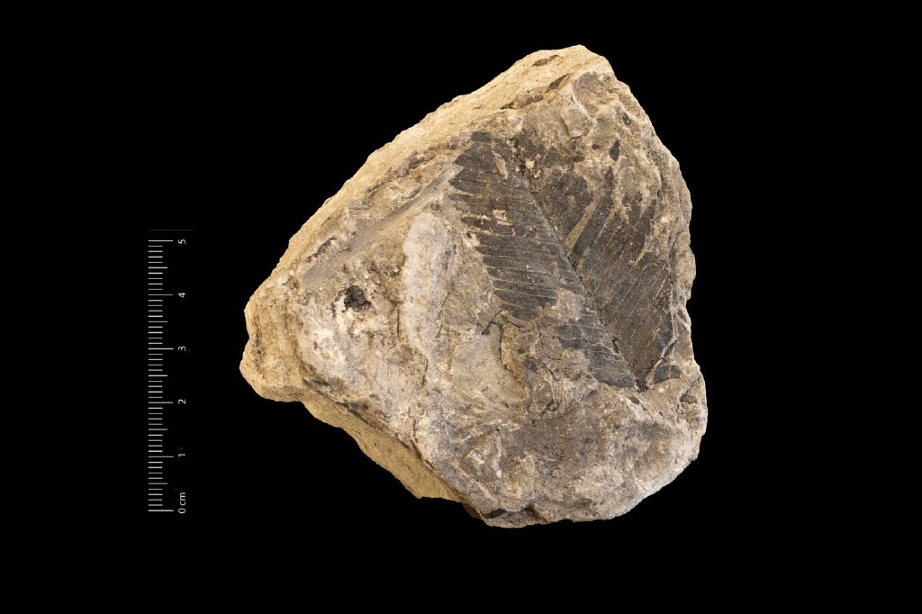 Frammento di foglia allungata di dimensioni 60x35mm, rachide largo 2 mm. Segmenti che si attaccano al rachide con tutta la base, formando un angolo di circa 70°. Apici appuntiti, segmenti leggermente falcati. Dimensione segmenti 22x3 mm. Nervature 9/segmento