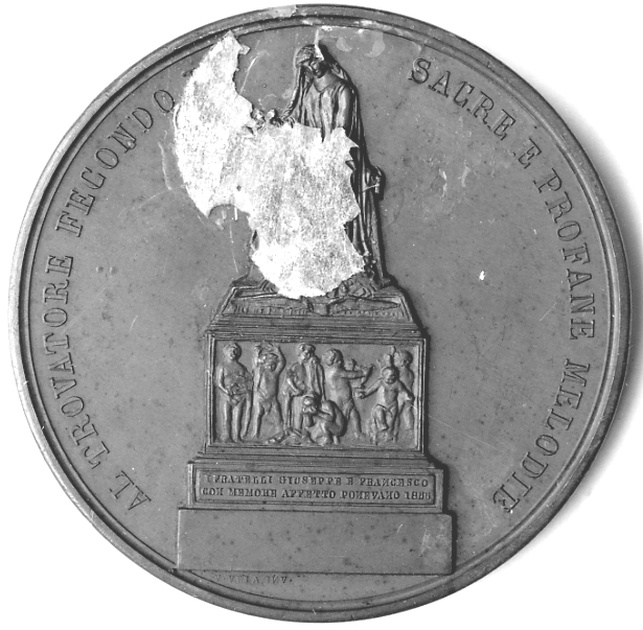 Dritto: Testa di profilo di Gaetano Donizetti a d. Rovescio: Monumento sepolcrale di Gaetano Donizetti