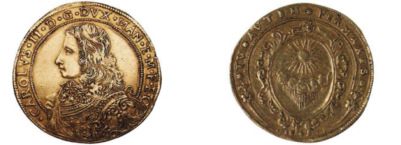 Dritto: CAROLVS II D G DVX MAN (ET) M F (ET) C. Rovescio: TV AVTEM PERMANES