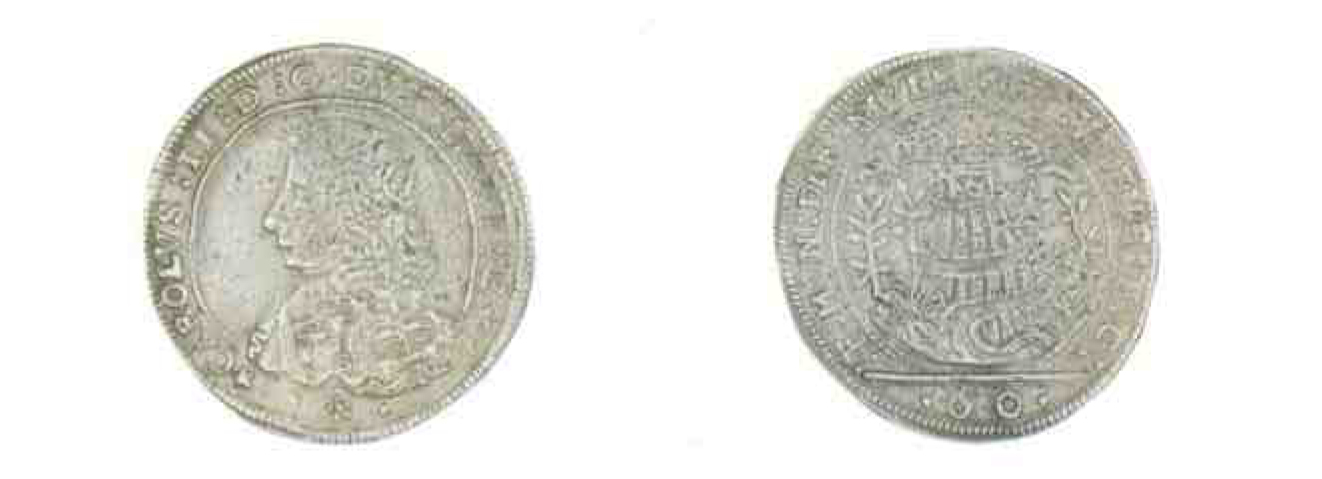 Dritto: CAROLVS II D G DVX MANTVE. Rovescio: (ET) MON FER NIVER RET VMENE (ET) C