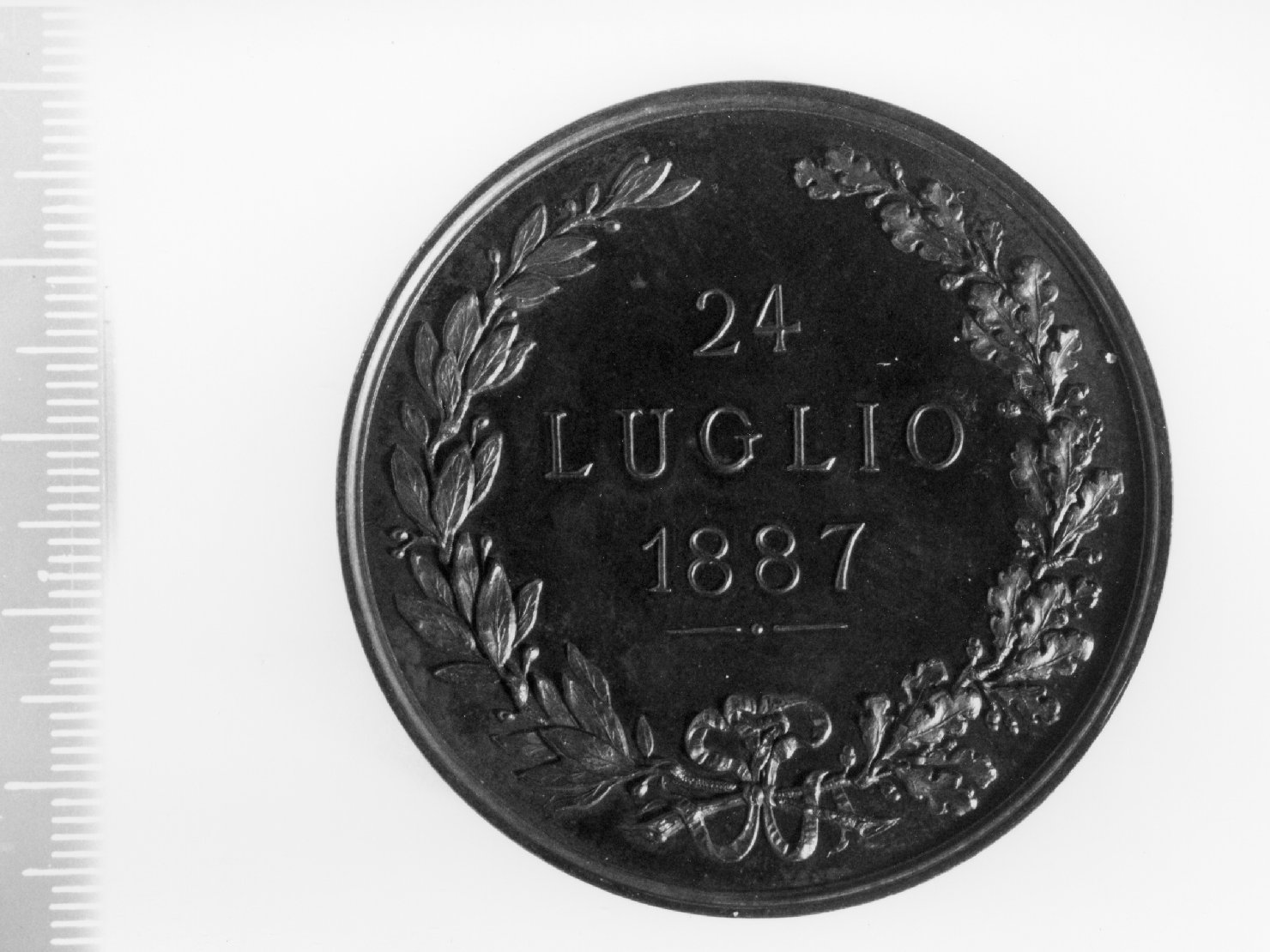 Dritto: Monumento a Giuseppe Garibaldi eretto ai Giardini di Venezia. Rovescio: Legenda entro corona d'alloro e quercia con nastro