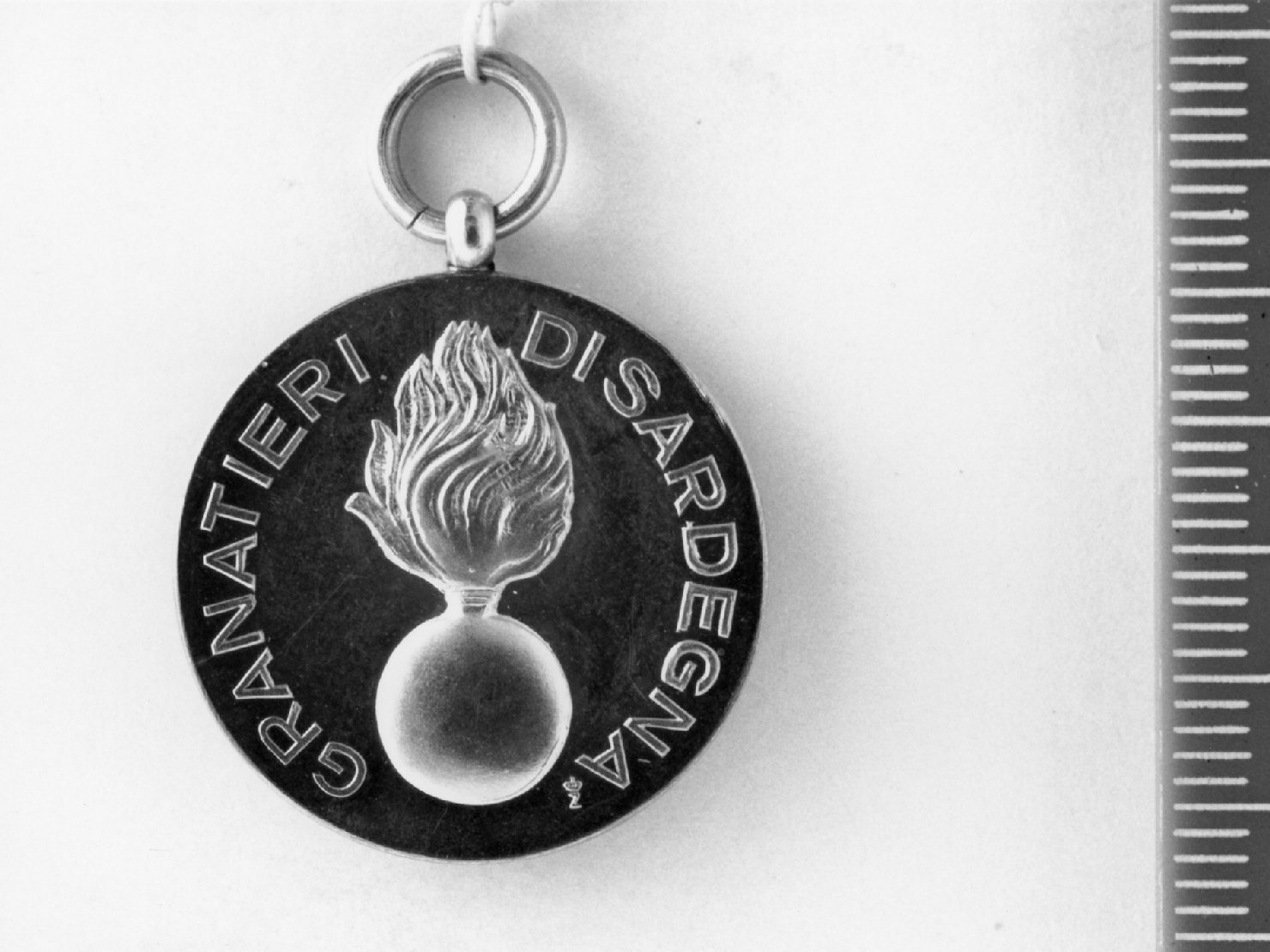 Dritto: Statua del Granatiere dal monumento a Carlo Alberto di Torino; con appiccagnolo ed anellino. Rovescio: Granata fiammeggiante