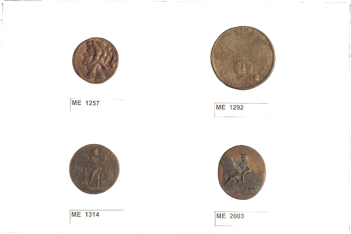 Dritto: Testa a s. di Bramante architetto. Rovescio: Donna seduta con profilo verso d. in mano tiene regolo e compasso (architettura); con il piede d. calpesta un sasso (?) ed alla sua s. il prospetto della basilica di S. Pietro